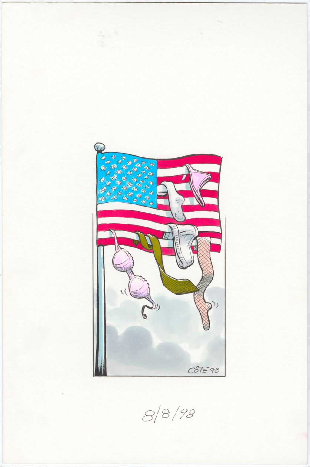 [Le drapeau des États-Unis soutien des sous-vêtements : bas-culotte, cravate, soutien-gorge, caleçon et bas], 8 août 1998, Archives nationales à Québec, Fonds André-Philippe Côté, (03Q,P687,S1,P98-08-08), André-Philippe Côté.