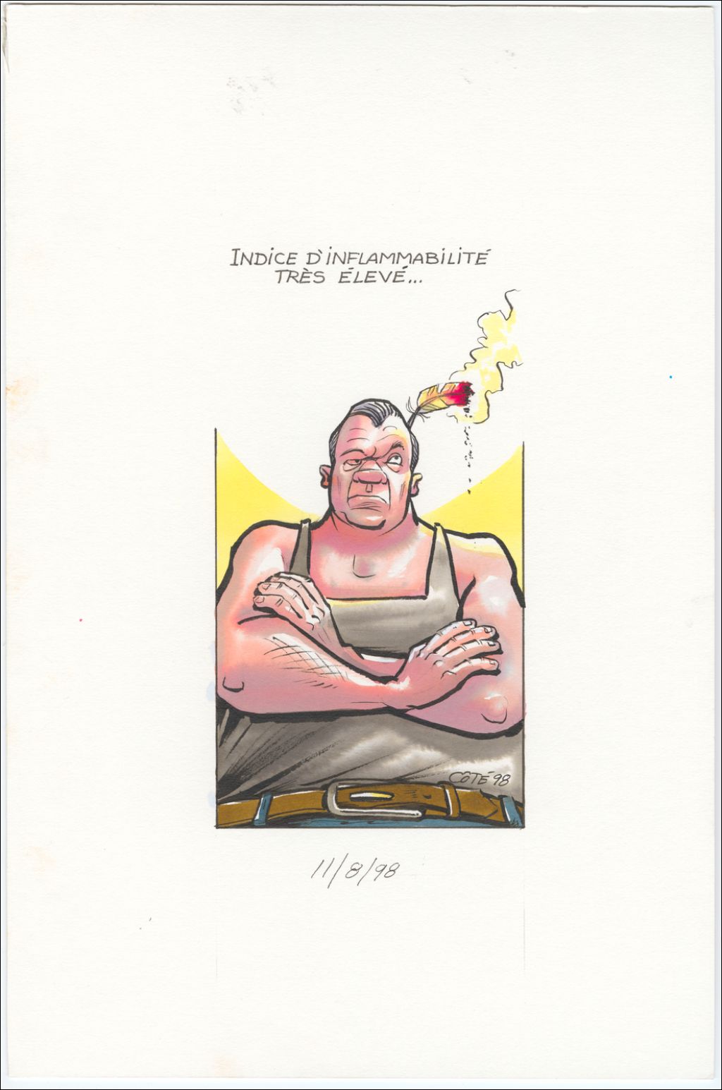 Indice d'inflammabilité très élevé… [Un autochtone a les bras croisés et une plume brûle sur sa tête], 11 août 1998, Archives nationales à Québec, Fonds André-Philippe Côté, (03Q,P687,S1,P98-08-11), André-Philippe Côté.