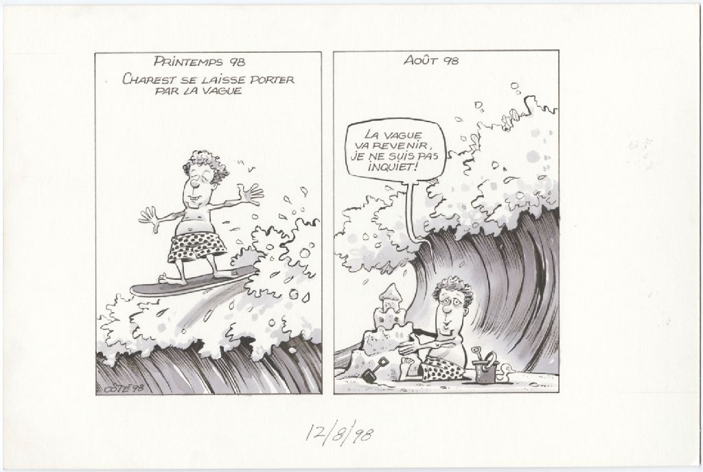 Printemps 98 : Charest se laisse porter par la vague [Jean Charest fait du surf] Août 98 : [Jean Charest] : « La vague va revenir, je ne suis pas inquiet ! » [Jean Charest fait un château de sable et une grosse vague est derrière lui ]