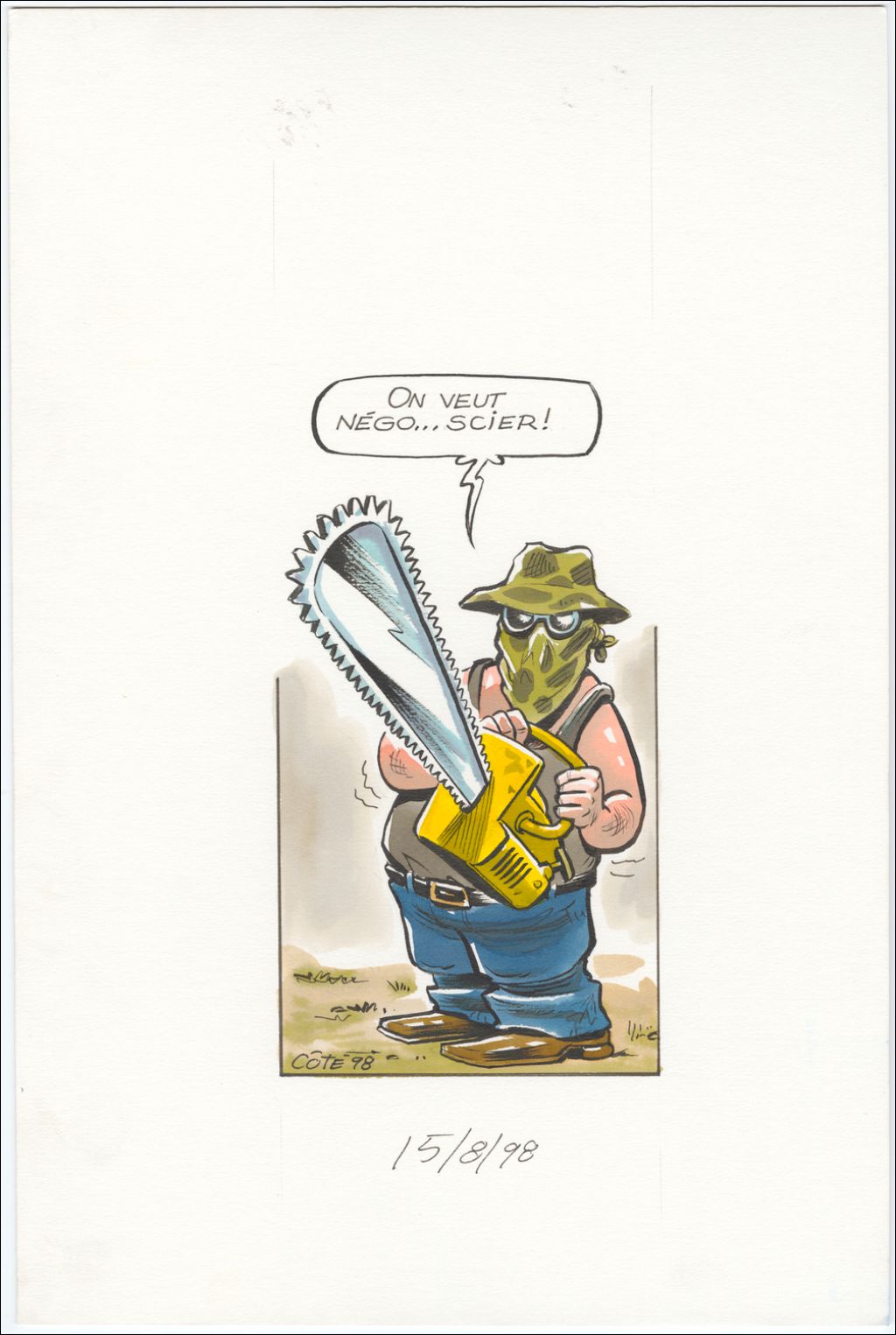 [Micmac masqué d'un foulard et de lunettes fumées] : « On veut négo…scier ! » [Il tient une scie à chaîne]