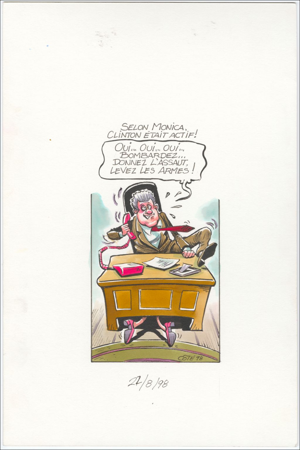 Selon Monica, Clinton était actif! [Bill Clinton] : "Oui… Oui… Oui… Bombardez… Donnez l'assaut, levez les armes!", 22 août 1998, Archives nationales à Québec, Fonds André-Philippe Côté, (03Q,P687,S1,P98-08-22), André-Philippe Côté.