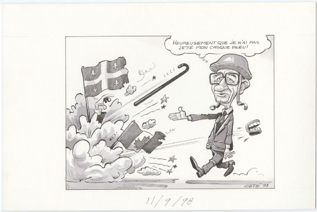 [Sylvain Simard] : "Heureusement que je n'ai pas jeté mon casque bleu!", 11 septembre 1998, Archives nationales à Québec, Fonds André-Philippe Côté, (03Q,P687,S1,P98-09-11-1), André-Philippe Côté.