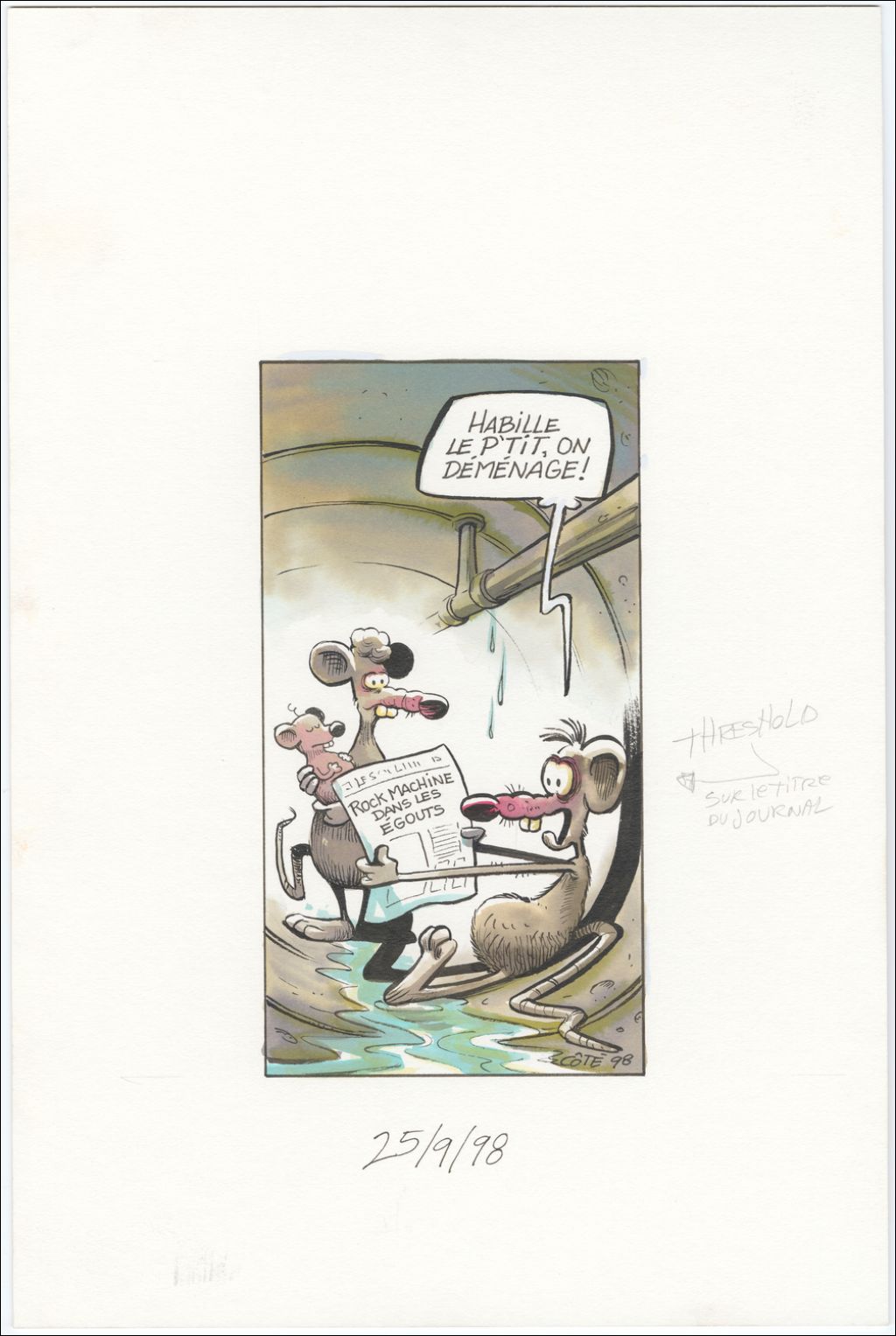 Rock Machine dans les égouts. [Rat] : "Habille le p'tit, on déménage!"