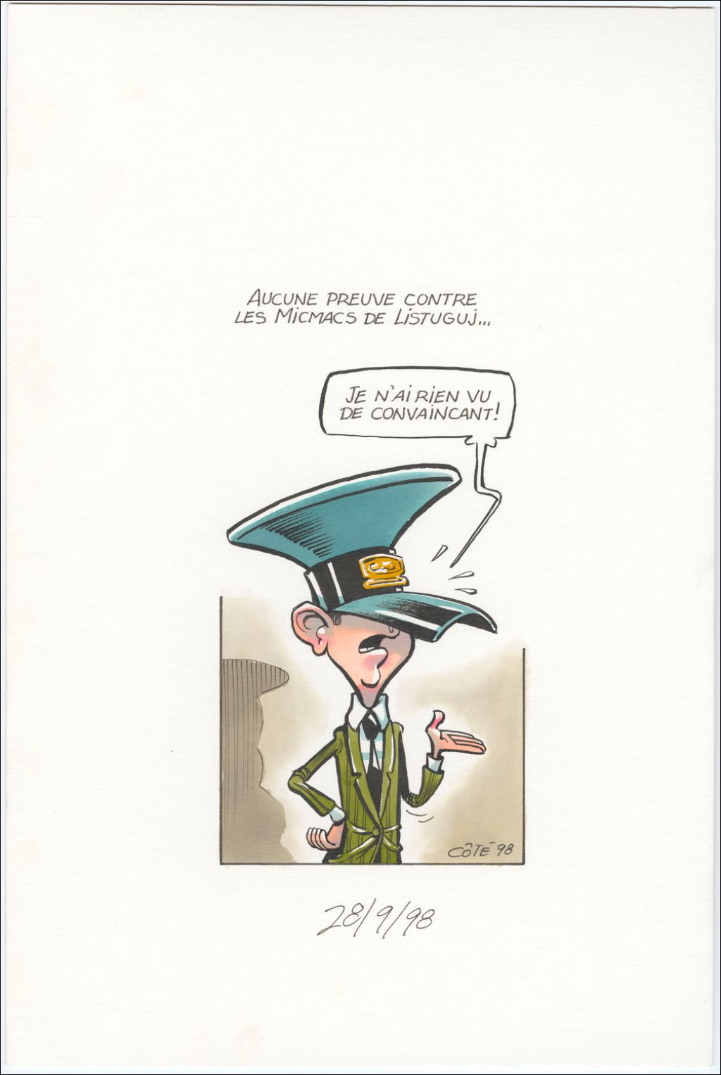 Aucune preuve contre les Micmacs de Listuguj… [Policier] : "Je n'ai rien vu de convaincant!", 28 septembre 1998, Archives nationales à Québec, Fonds André-Philippe Côté, (03Q,P687,S1,P98-09-28), André-Philippe Côté.