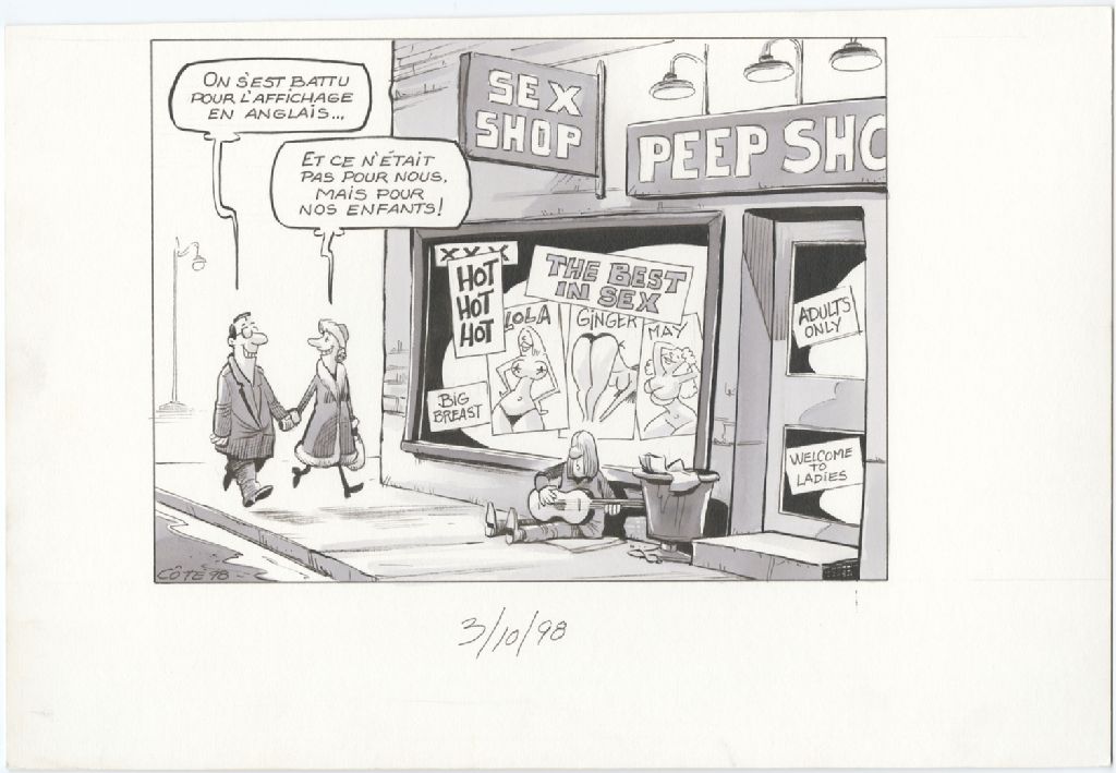 [Homme] : "On s'est battu pour l'affichage en anglais…" [Femme] : "Et ce n'était pas pour nous, mais pour nos enfants!", 3 octobre 1998, Archives nationales à Québec, Fonds André-Philippe Côté, (03Q,P687,S1,P98-10-03-1), André-Philippe Côté.