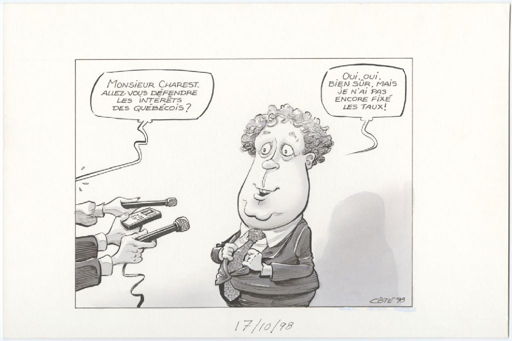 [Journaliste] : « Monsieur Charest, allez-vous défendre les intérêts des québécois ? » [Jean Charest] : « Oui, oui, bien sûr, mais je n'ai pas encore fixé les taux ! », 17 octobre 1998, Archives nationales à Québec, Fonds André-Philippe Côté, (03Q,P687,S1,P98-10-17-1), André-Philippe Côté.