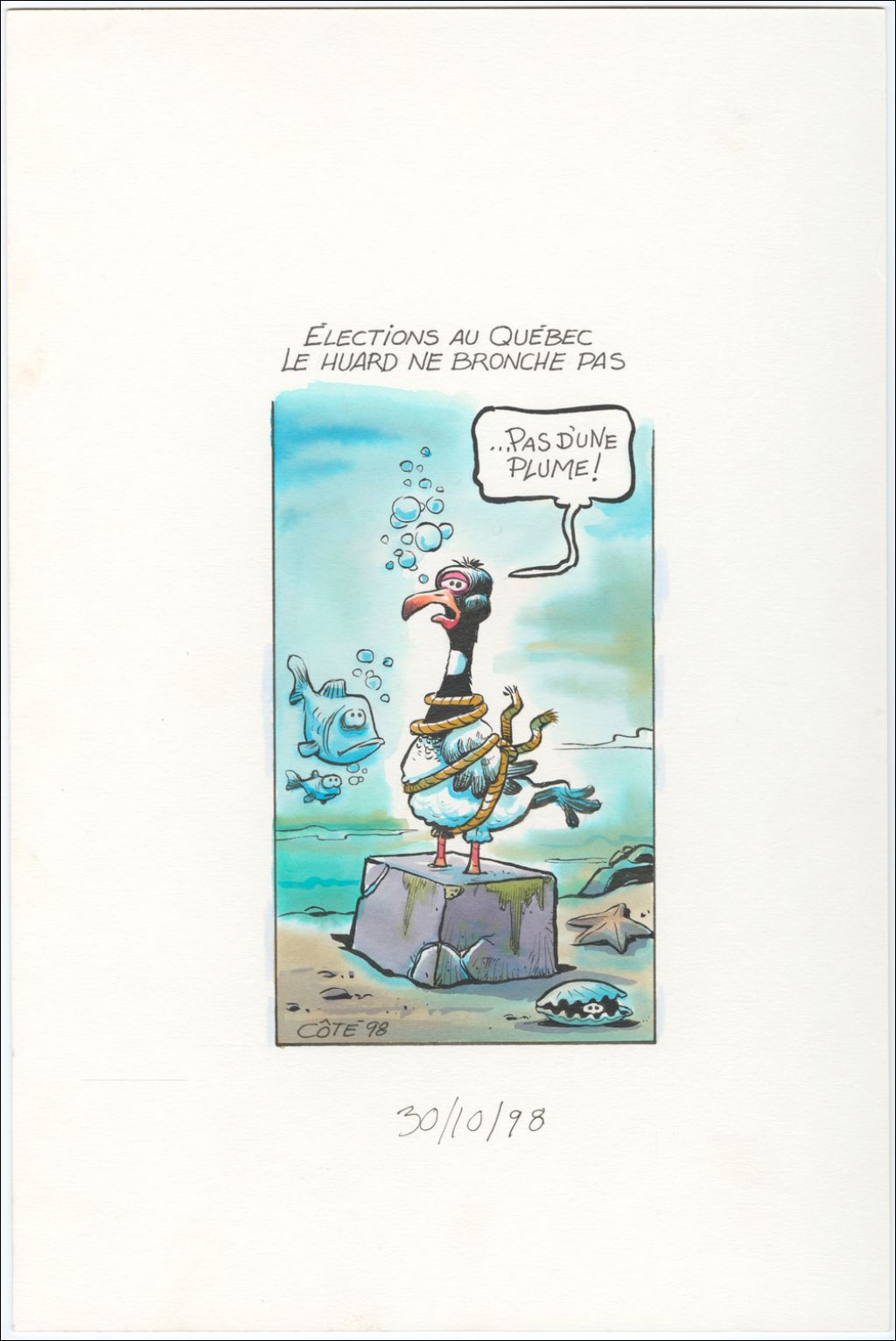 Élections au Québec. Le huard ne bronche pas [Huard] : « …pas d'une plume ! » [Le huard a les deux palmes dans le béton au fond d'un océan et est attaché]
