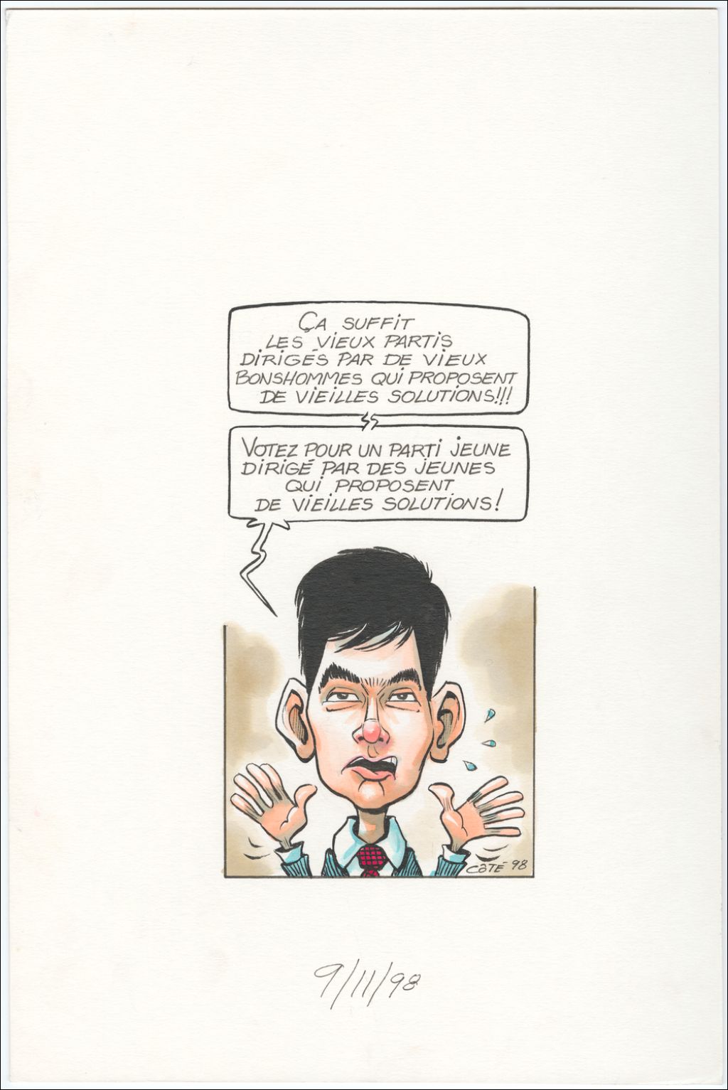 [Mario Dumont] : « Ça suffit les vieux partis dirigés par de vieux bonshommes qui proposent de vieilles solutions !!! Votez pour un parti jeune dirigé par des jeunes qui proposent de vieilles solutions ! »