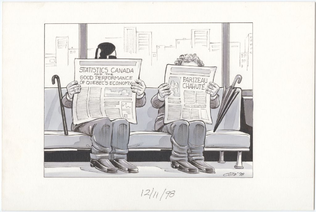 [Lucien Bouchard lit un journal] : « Statistics Canada and the good performance of Quebec's Economy » [Jean Charest lit un journal] : « Parizeau Chahuté »