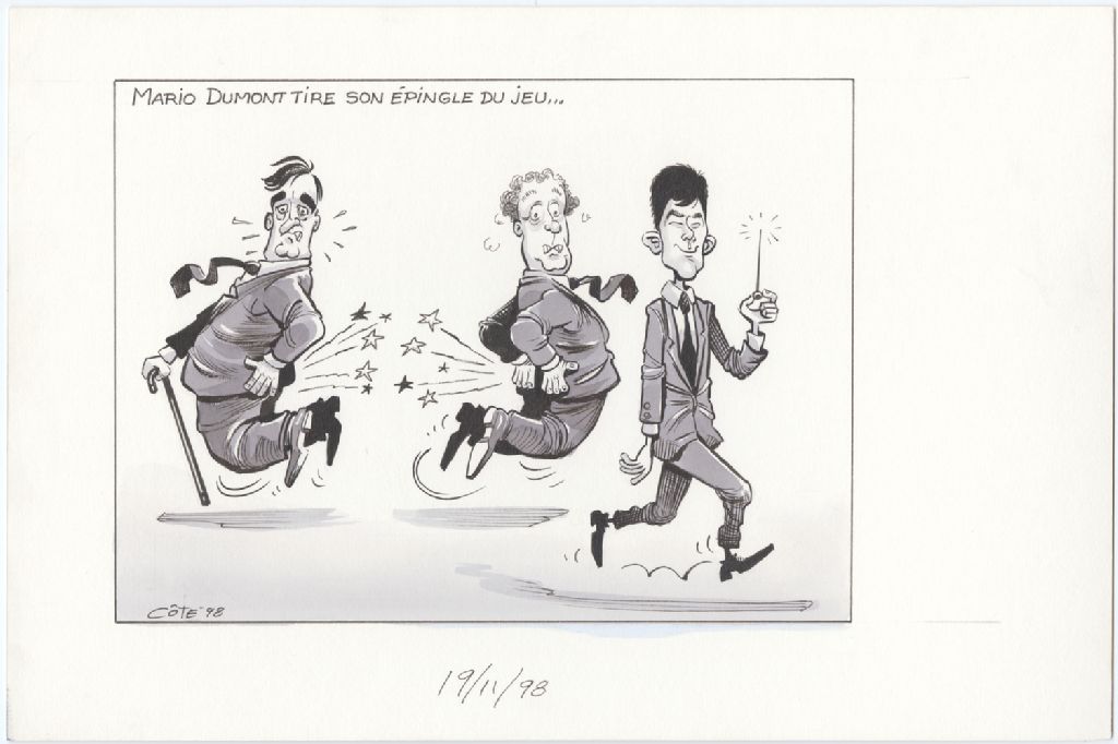 Mario Dumont tire son épingle du jeu… [Mario Dumont tient une épingle et vient de piquer les fesses de Lucien Bouchard et Jean Charest]