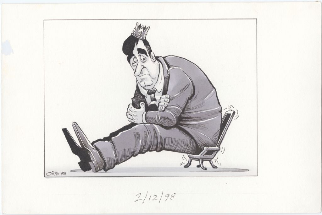 [Lucien Bouchard est assis sur un petit siège et porte une couronne]