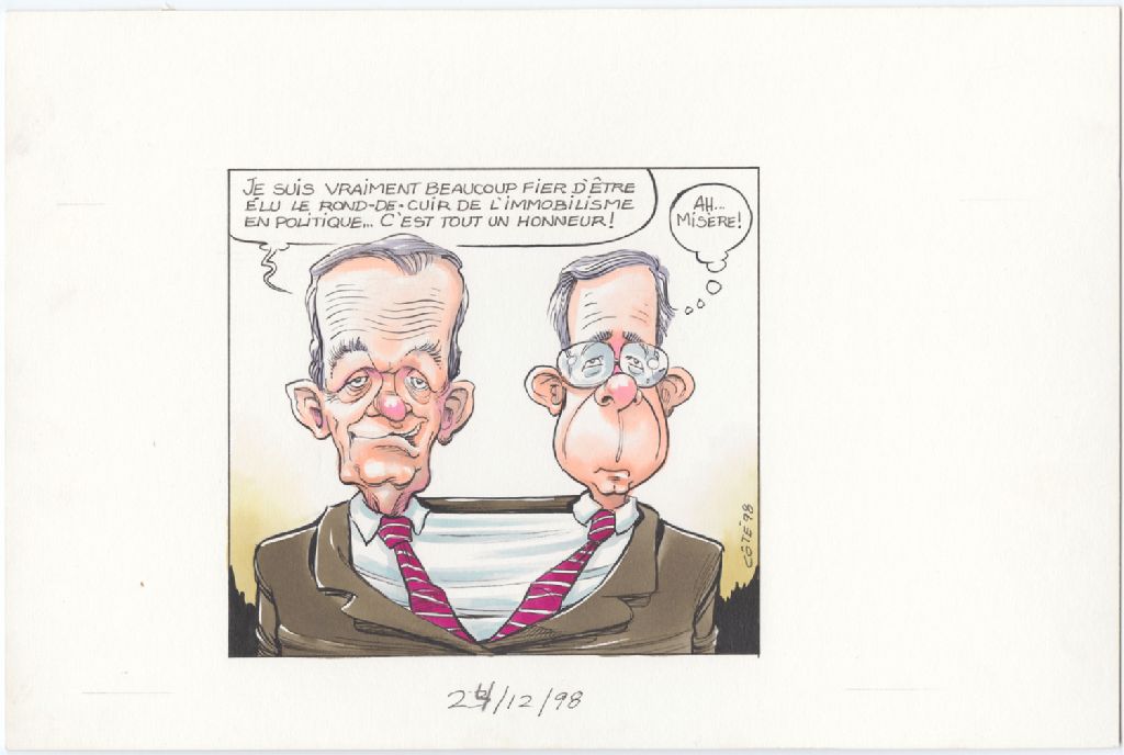 [Jean Chrétien] : « Je suis vraiment beaucoup fier d'être élu le rond-de-cuir de l'immobilisme en politique… c'est tout un honneur ! » [Stéphane Dion] : « Ah misère ! »