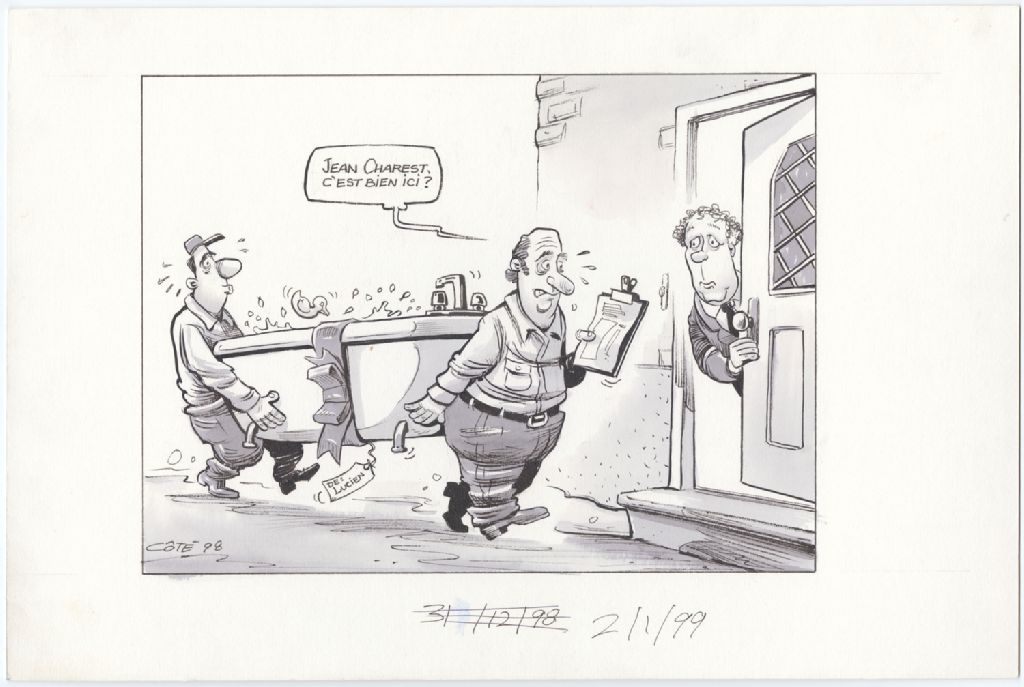 [Livreur] : « Jean Charest, c'est bien ici? » [Deux livreurs apportent un bain à Jean Charest. Il est écrit que le colis provient de Lucien [Bouchard]]