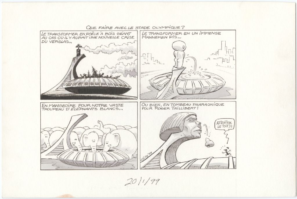 Que faire avec le stade olympique? Le tranformer en poêle à bois géant au cas où il y aurait une nouvelle crise du verglas… Le transformer en un immense Menneken pis… En mangeoire pour notre vaste troupeau d'éléphants blancs… Ou bien, en tombeau pharaonique pour Roger Taillibert ! [Le nez du monument tombe [Homme] : « Attention, le toit !!! »