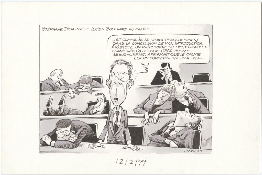 Stéphane Dion invite Lucien Bouchard au calme… [Stéphane Dion] : « … et comme je le disais précédemment dans la conclusion de mon introduction, Aristote, un philosophe du Petit Larousse ayant vécu à la page 1092 avant Jésus-Christ, affirmait que le calme est un concept... bla... bla... bla... »
