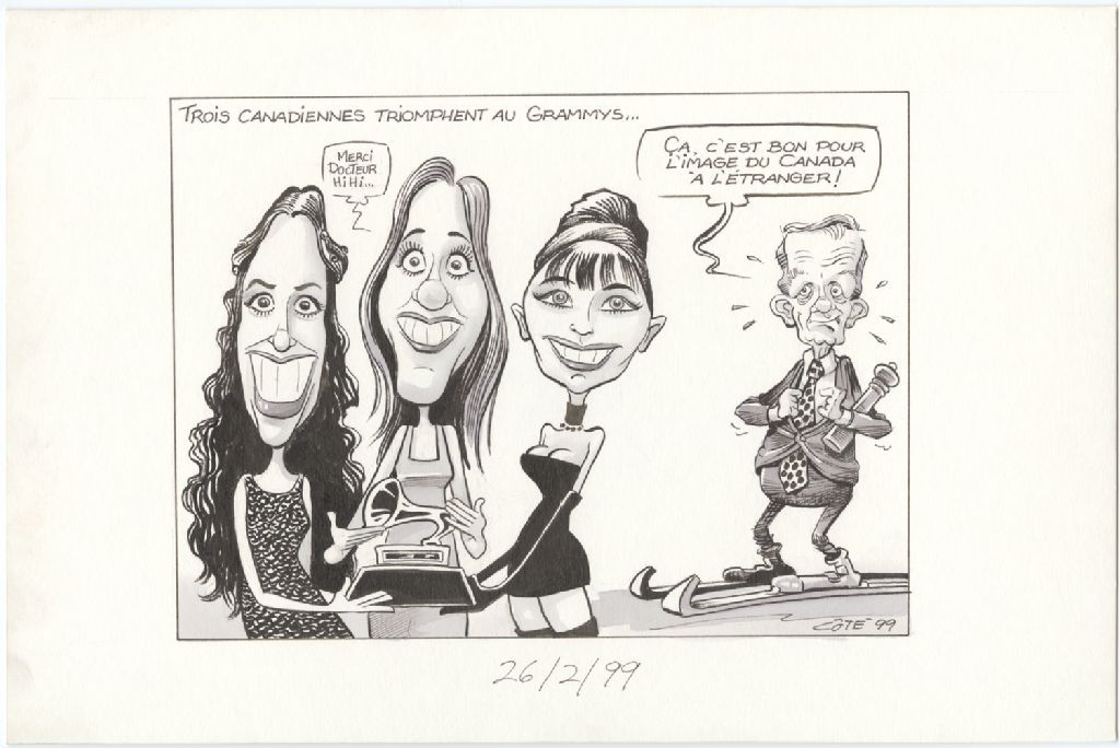 Trois canadiennes triomphent au Grammys… [Jean Chrétien] : « Ça, c'est bon pour l'image du Canada à l'étranger ! » [Céline Dion] : « Merci docteur hihi... », 26 février 1999, Archives nationales à Québec, Fonds André-Philippe Côté, (03Q,P687,S1,P99-02-26-1), André-Philippe Côté.