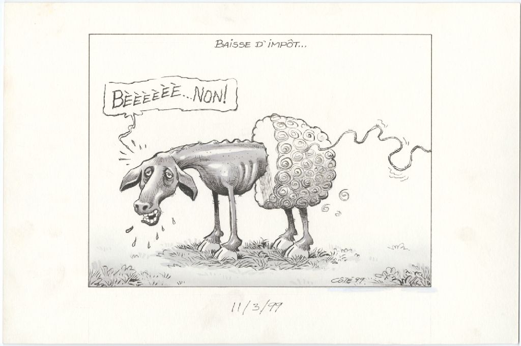 Baisse d'impôt… [Mouton] : « Bèèèèèè…non ! », 11 mars 1999, Archives nationales à Québec, Fonds André-Philippe Côté, (03Q,P687,S1,P99-03-11-1), André-Philippe Côté.