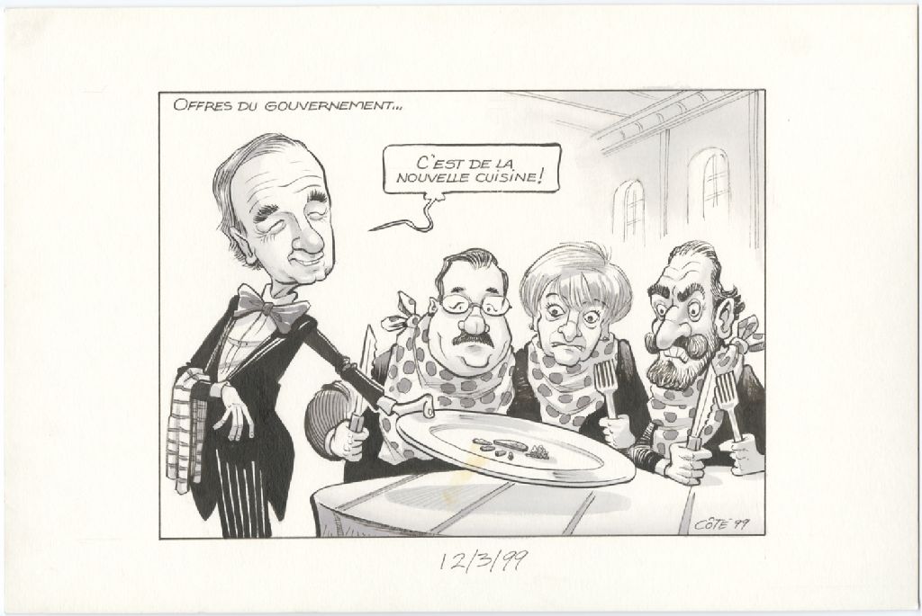 Offres du gouvernement… [Jacques Léonard] : « C'est de la nouvelle cuisine ! », 12 mars 1999, Archives nationales à Québec, Fonds André-Philippe Côté, (03Q,P687,S1,P99-03-12-1), André-Philippe Côté.