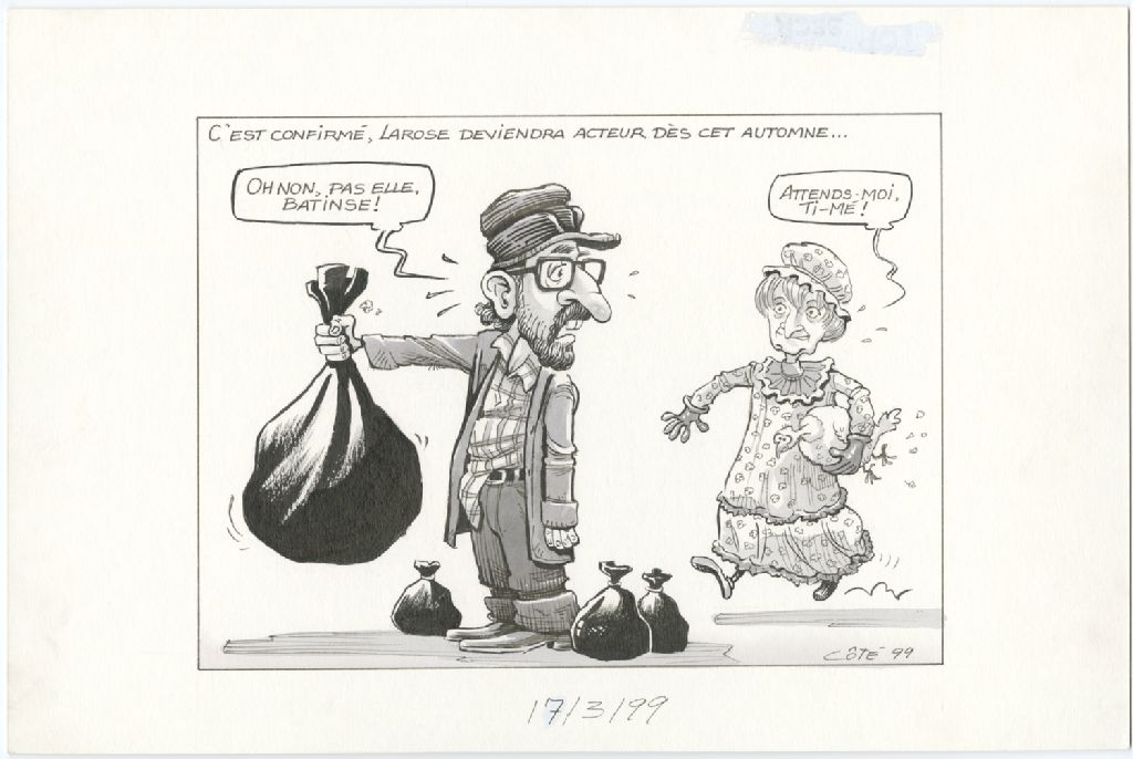 C'est confirmé, Larose deviendra acteur dès cet automne… [Gérald Larose déguisé en Ti-Mé de la Petite vie] : « Oh non, pas elle, batinse ! » [Lorraine Pagé déguisée en Moman de la Petite vie] : « Attends-moi Ti-Mé ! »