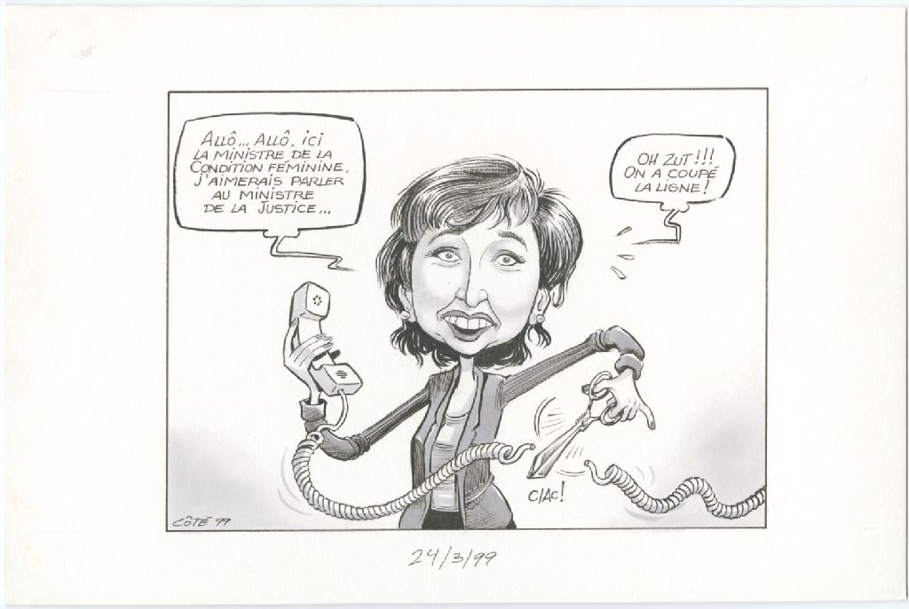 [Linda Goupil] : « Allô… Allô, ici la ministre de la Condition féminine, j'aimerais parler au ministre de la Justice… Oh zut ! On a coupé la ligne ! », 24 mars 1999, Archives nationales à Québec, Fonds André-Philippe Côté, (03Q,P687,S1,P99-03-24-1), André-Philippe Côté.