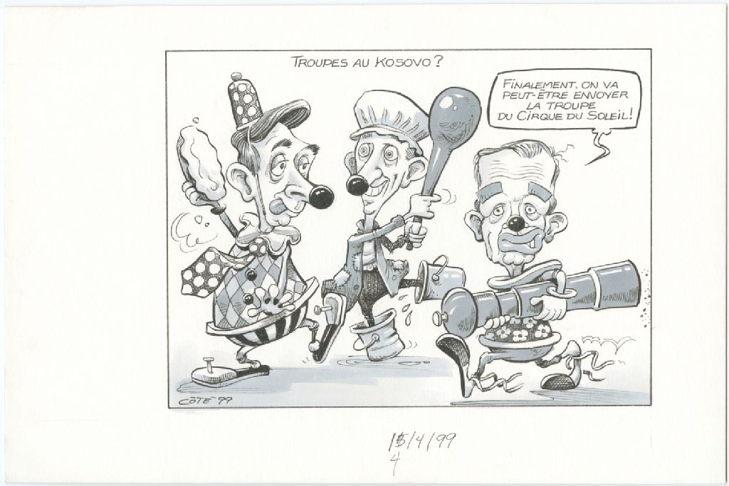 Troupes au Kosovo ? [Jean Chrétien] : « Finalement, on va peut-être envoyer la troupe du Cirque du Soleil ! », 14 avril 1999, Archives nationales à Québec, Fonds André-Philippe Côté, (03Q,P687,S1,P99-04-14-1), André-Philippe Côté.