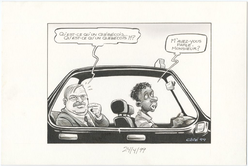 [Jacques Parizeau] : « Qu'est-ce qu'un québécois… qu'est-ce qu'un québécois ?!? » [Chauffeur de taxi africain] : « M'avez-vous parlé, monsieur ? », 24 avril 1999, Archives nationales à Québec, Fonds André-Philippe Côté, (03Q,P687,S1,P99-04-24-1), André-Philippe Côté.
