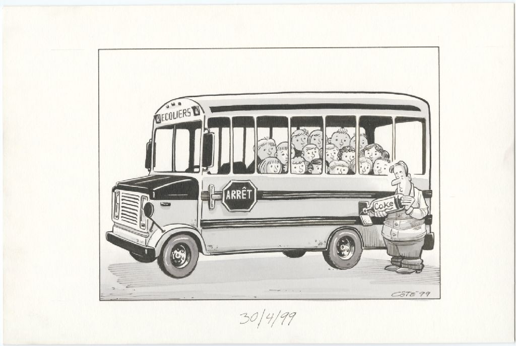 [Le chauffeur d'un autobus scolaire verse du "Coke" (boisson gazeuse) à l'intérieur du réservoir de carburant de l'autobus]