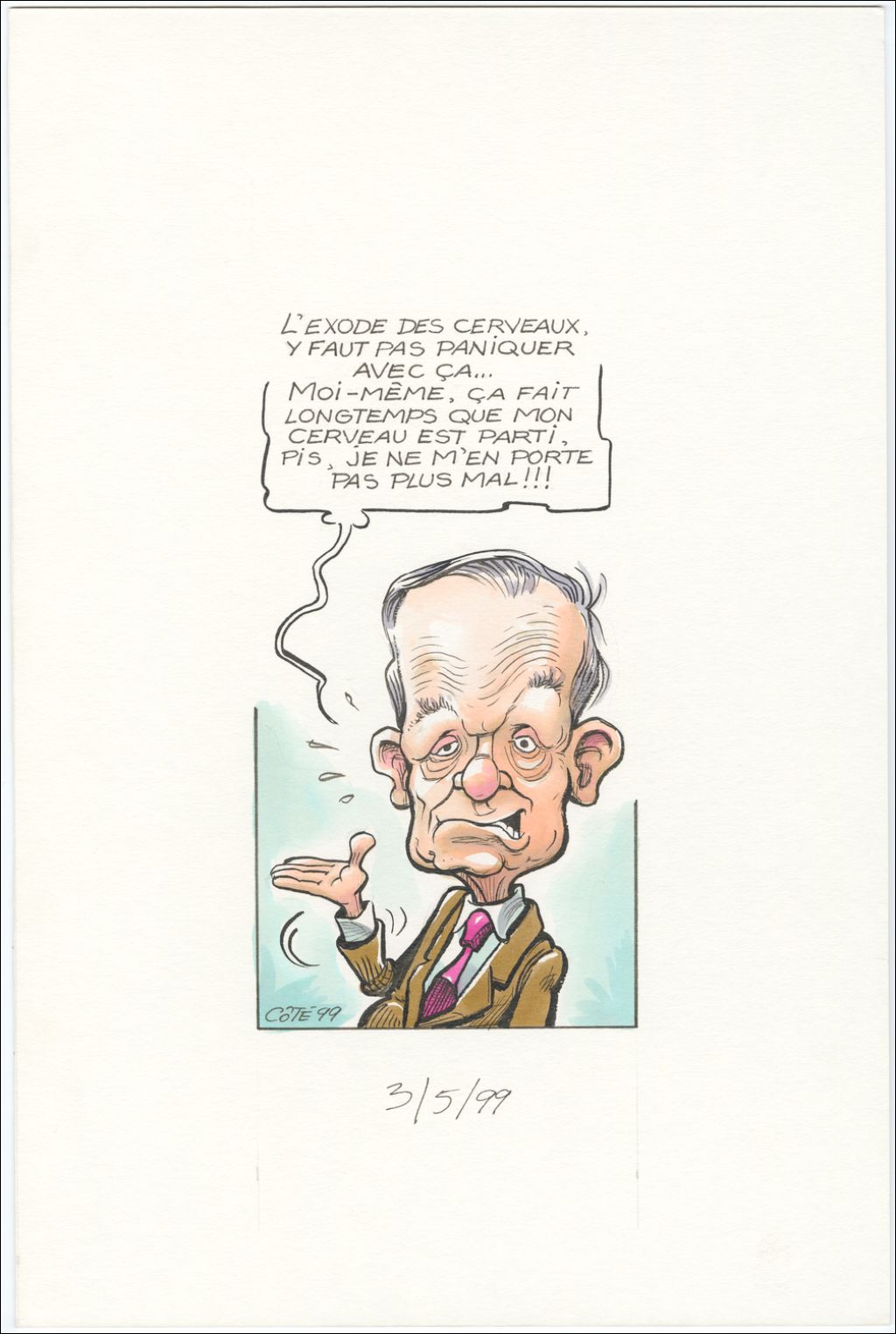 [Jean Chrétien] : « L'exode des cerveaux, y faut pas paniquer avec ça… moi-même, ça fait longtemps que mon cerveau est parti, pis je ne m'en porte pas plus mal !!! », 3 mai 1999, Archives nationales à Québec, Fonds André-Philippe Côté, (03Q,P687,S1,P99-05-03), André-Philippe Côté.