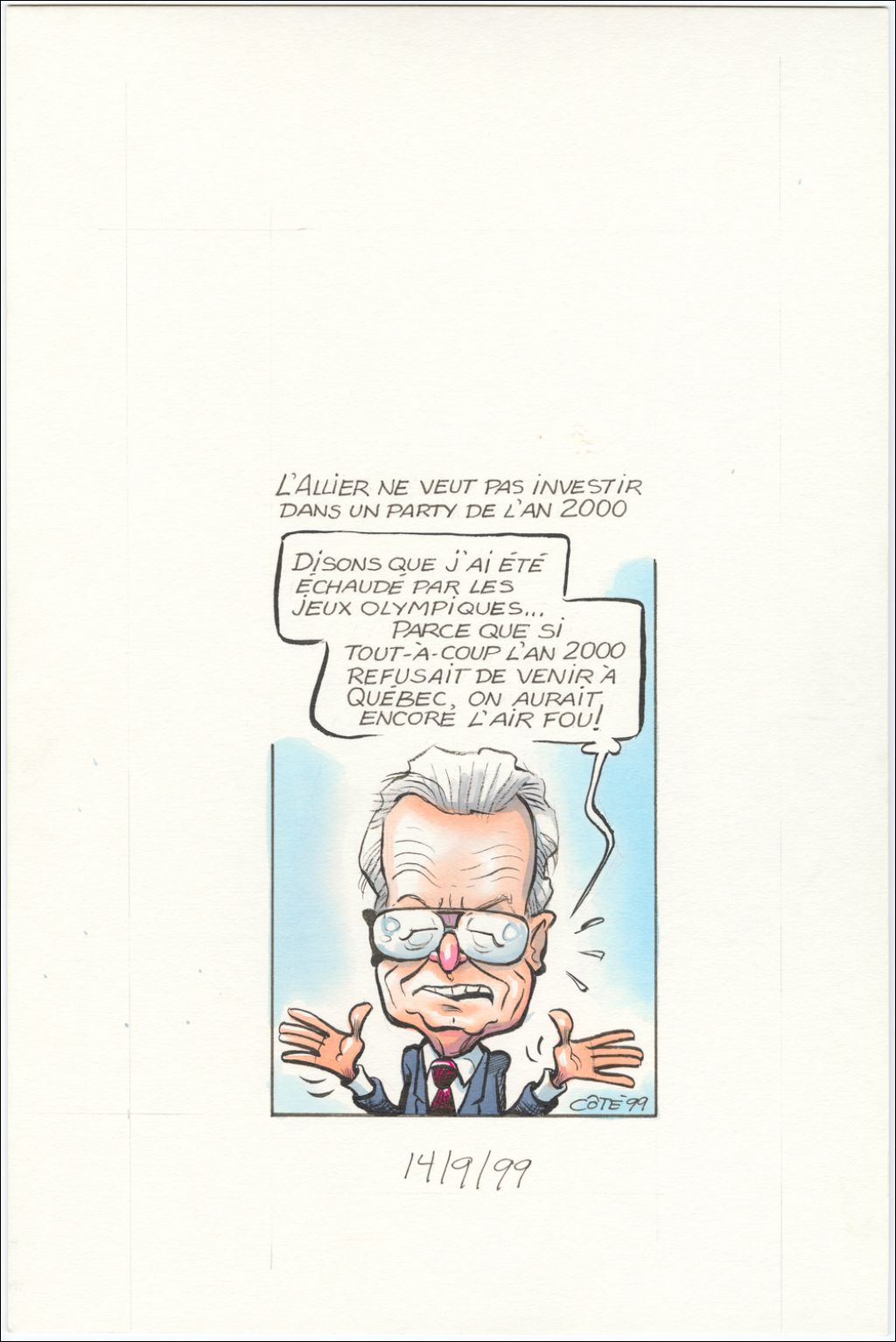 L'Allier ne veut pas investir dans un party de l'an 2000. [L'Allier] : "Disons que j'ai été échaudé par les jeux olympiques… Parce que si tout-à-coup l'an 2000 refusait de venir à Québec, on aurait l'air fou!"