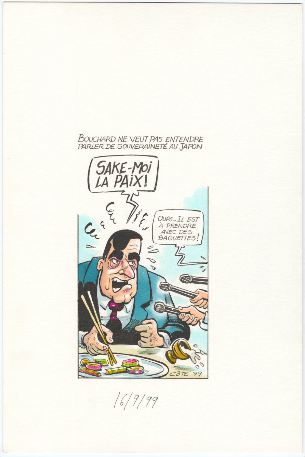 Bouchard ne veut pas entendre parler de souveraineté au Japon. [Bouchard] : "SAKE-MOI LA PAIX!" [Journalistes] : "Oups… il est à prendre avec des baguettes!", 16 septembre 1999, Archives nationales à Québec, Fonds André-Philippe Côté, (03Q,P687,S1,P99-09-16), André-Philippe Côté.