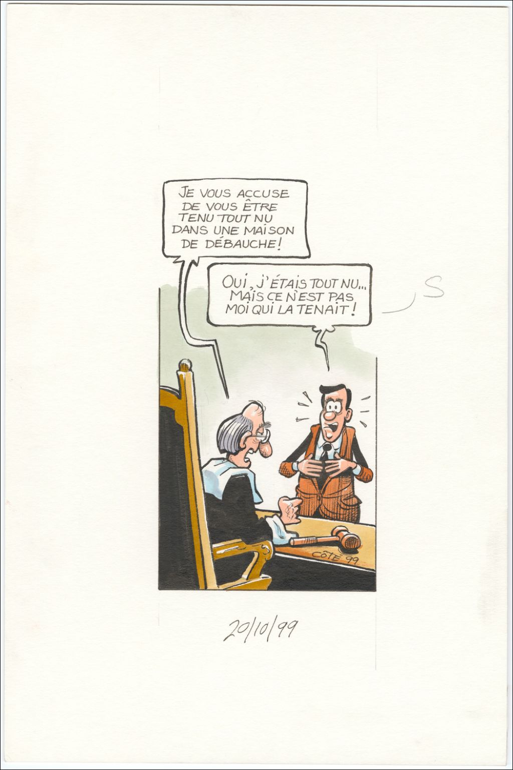[Juge] : « Je vous accuse de vous être tenu tout nu dans une maison de débauche ! » [Homme] : « Oui, j'étais tout nu… mais ce n'est pas moi qui la tenais ! »