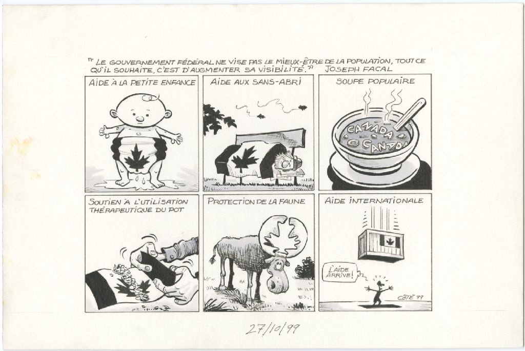 « Le Gouvernement fédéral ne vise pas le mieux-être de la population, tout ce qu'il souhaite, c'est d'augmenter sa visibilité. » Joseph Facal. Aide à la petite enfance. Aide aux sans-abri. Soupe populaire. Soutien à l'utilisation thérapeutique du pot. Protection de la faune. Aide internationale. [Homme] : « L'aide arrive ! »