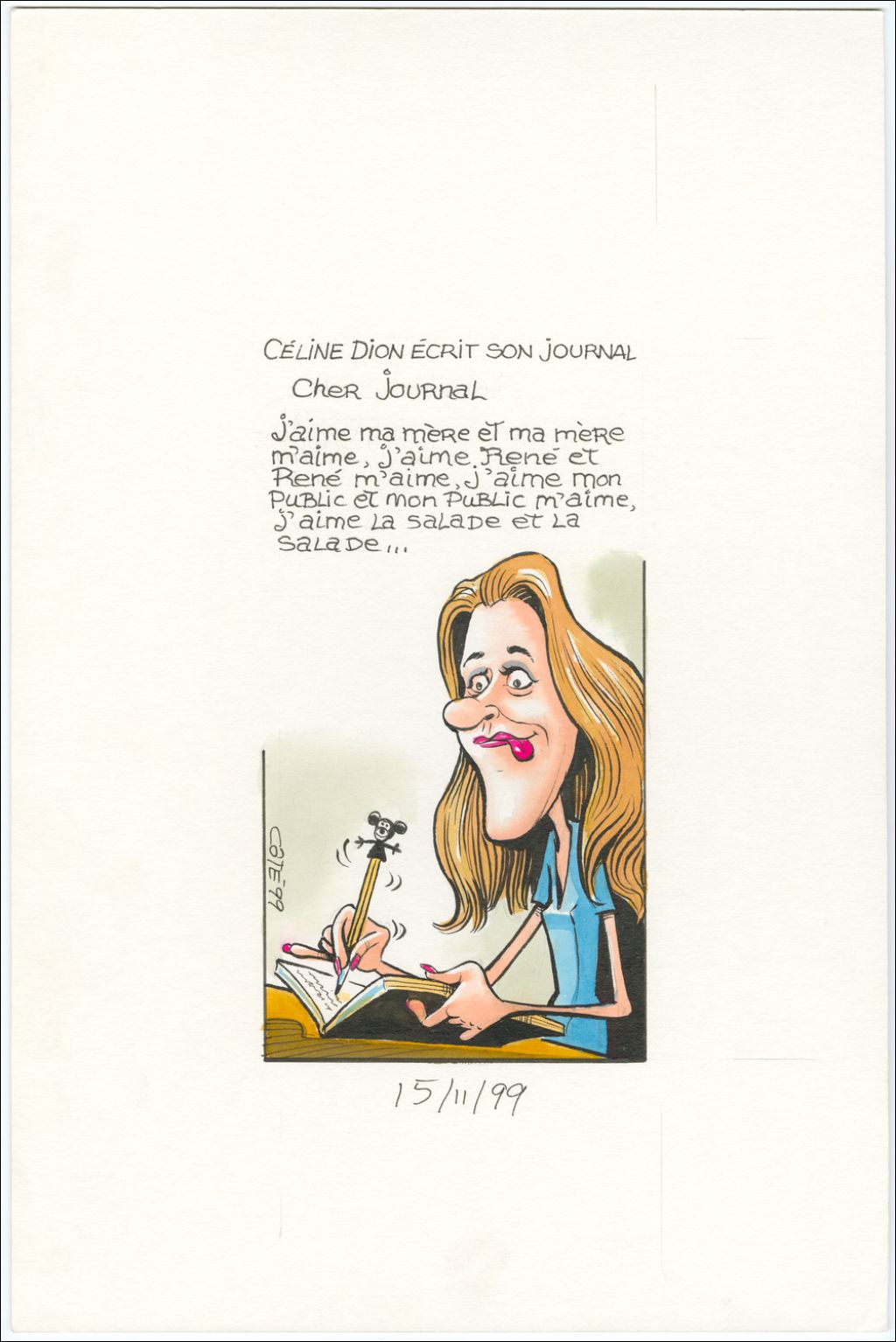 Céline Dion écrit son journal. Cher journal J'aime ma mère et ma mère m'aime, j'aime René et René m'aime, j'aime mon public et mon public m'aime, j'aime la salade et la salade