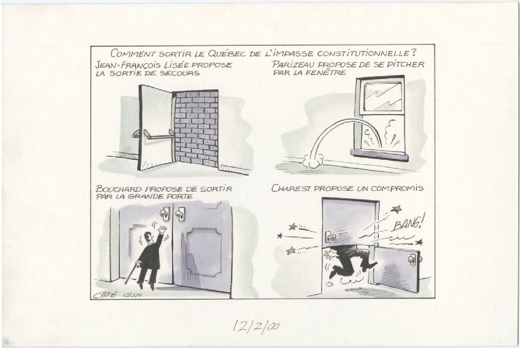 Comment sortir le Québec de l'impasse constitutionnelle ? Jean-François Lisée propose la sortie de secours. Parizeau propose de se pitcher par la fenêtre. Bouchard propose de sortir par la grande porte. Charest propose un compromis.