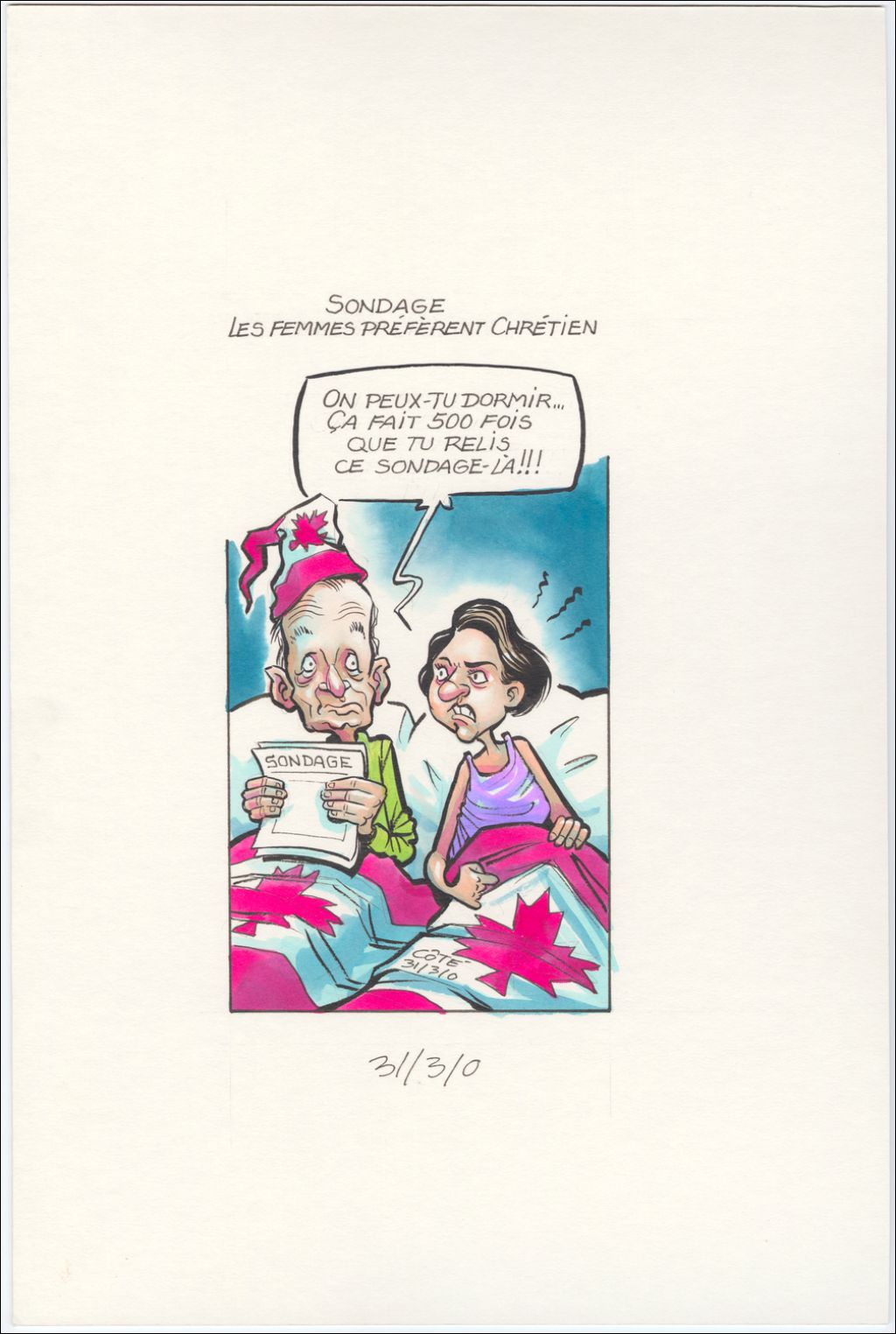 Sondage. Les femmes préfèrent Chrétien. [Aline Chaîné] : "On peux-tu dormir… Ça fait 500 fois que tu relis ce sondage-là!!!"