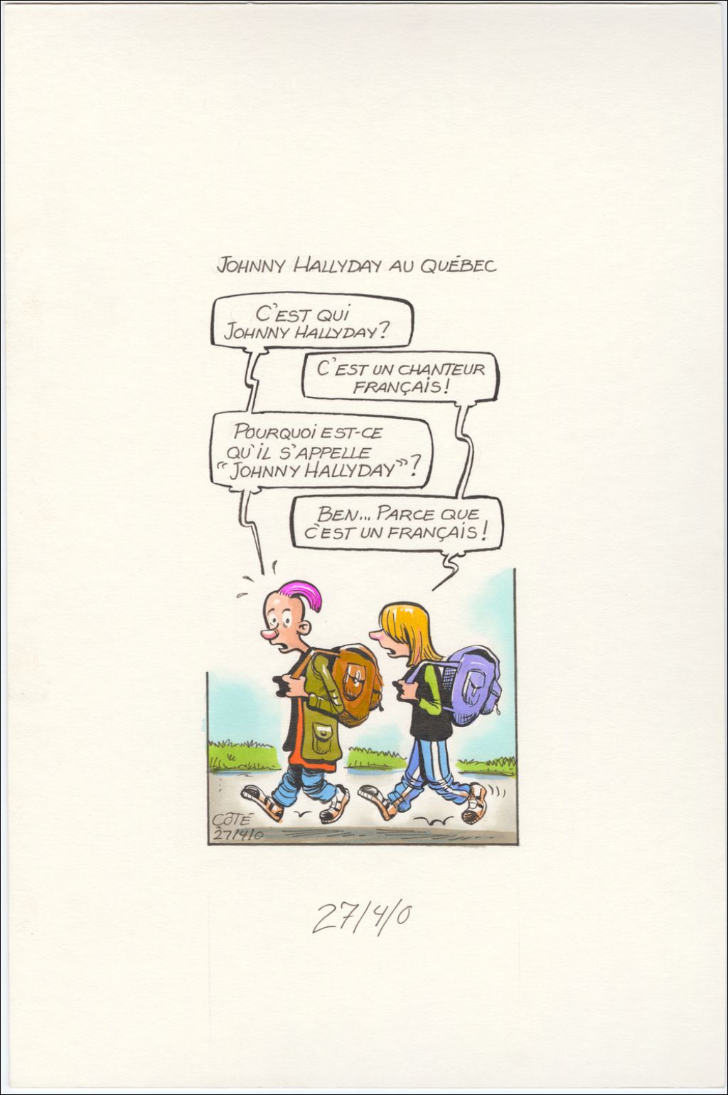 Jeune homme : "C'est qui Johnny Hallyday?Jeune fille : "C'est un chanteur français!Jeune homme : "Pourquoi est-ce qu'il s'appelle "Johnny Hallyday"?"Jeune fille : "Ben¿ parce que c'est un français!"
