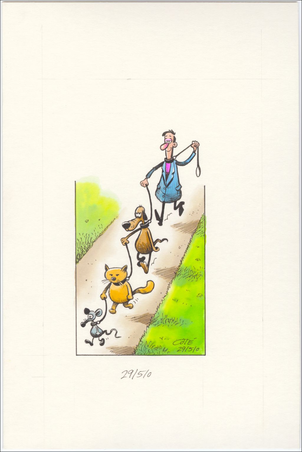 On peut voir une souris tenue en laisse par un chat, qui est tenu en laisse par un chien, qui est tenu en laisse par un homme qui tiens lui-même sa laisse