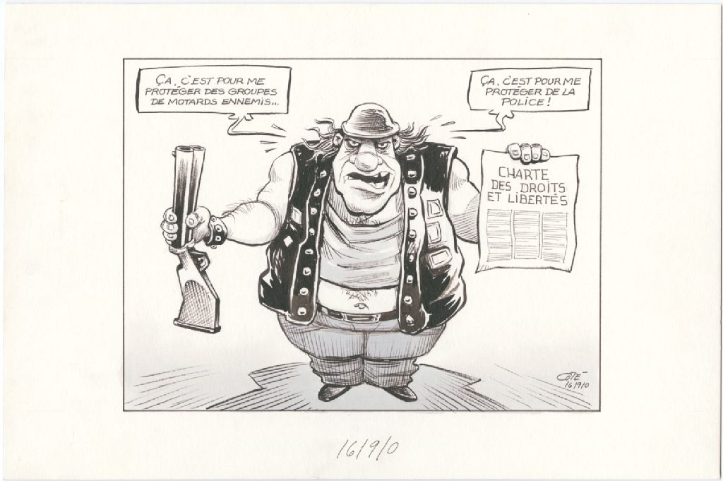 [Motard] : « Ça, c'est pour me protéger des groupes de motards ennemis… » [Le motard tient un fusil] [Motard] : « Ça, c'est pour me protéger de la police ! » [Le motard tien la charte des droits et libertés], 16 septembre 2000, Archives nationales à Québec, Fonds André-Philippe Côté, (03Q,P687,S1,P2000-09-16-1), André-Philippe Côté.