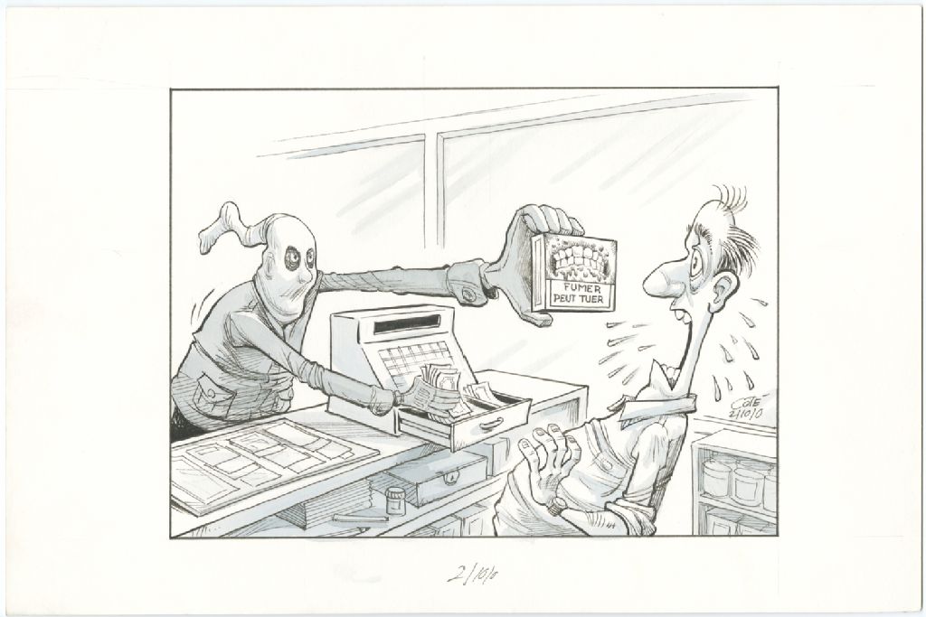 [Un voleur effraie un propriétaire de dépanneur avec un paquet de cigarette " Fumer peut tuer "]