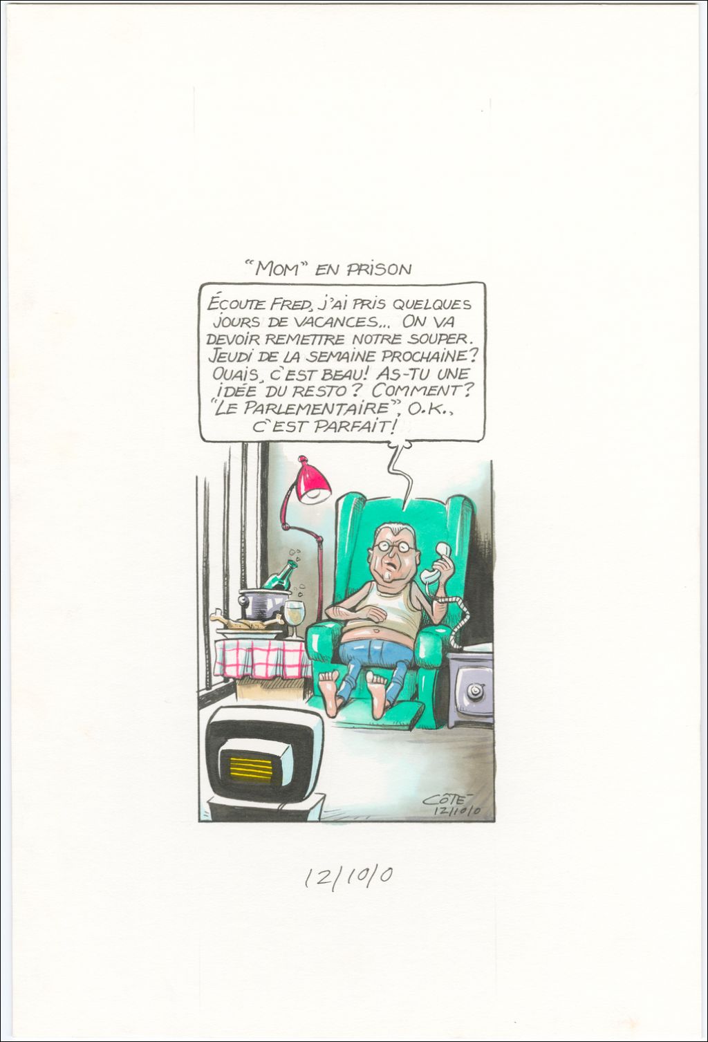 "Mom" en prison. "Écoute Fred, j'ai pris quelques jours de vacances… On va devoir remettre notre souper. Jeudi de la semaine prochaine? Ouais, c'est beau! As-tu une idée du resto? Comment? "Le Parlementaire", o.k., c'est parfait!"
