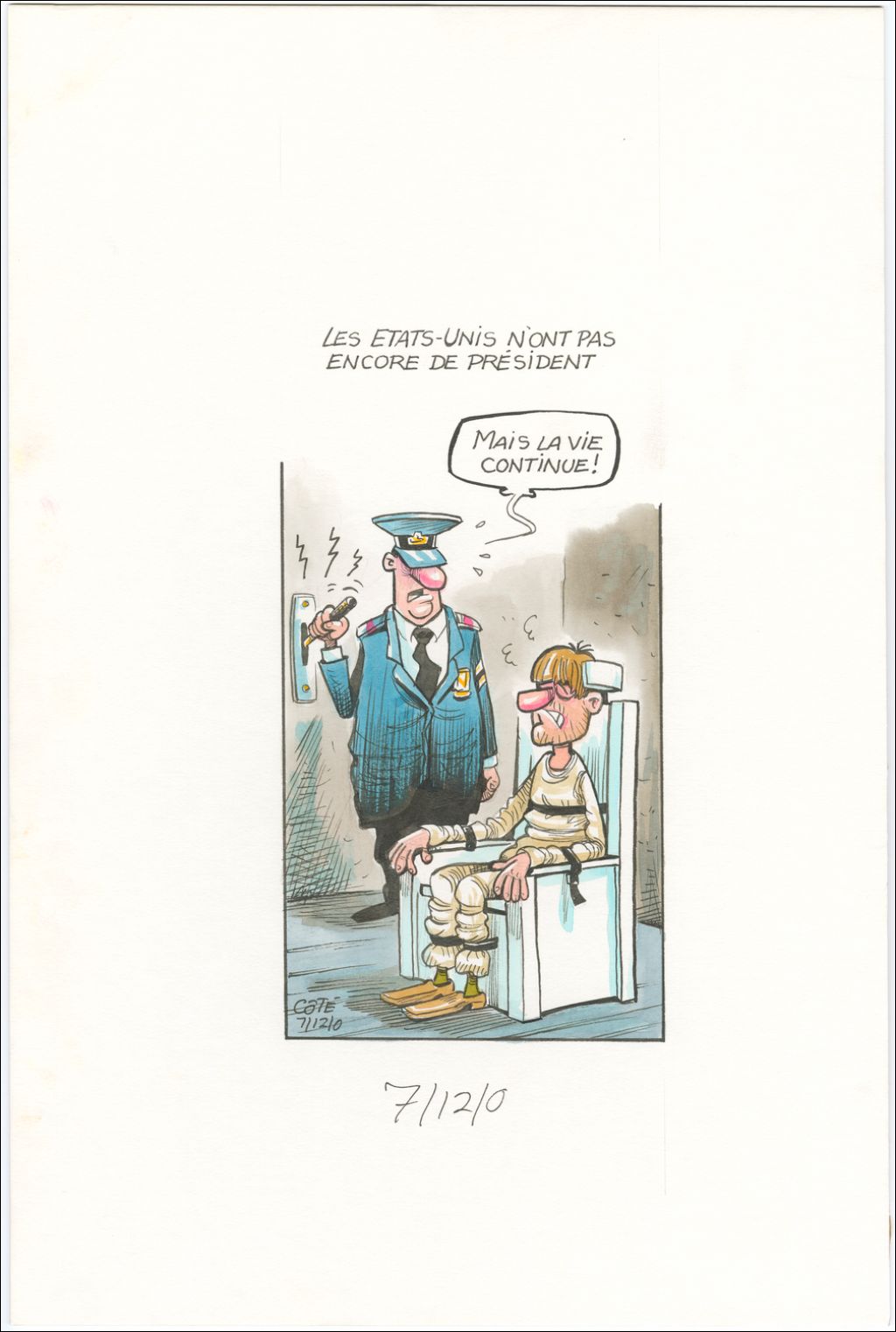 Les États-Unis n'ont pas encore de président. [Gardien de prison se préparant pour une peine capitale] : "Mais la vie continue!", 7 décembre 2000, Archives nationales à Québec, Fonds André-Philippe Côté, (03Q,P687,S1,P2000-12-07-1), André-Philippe Côté.