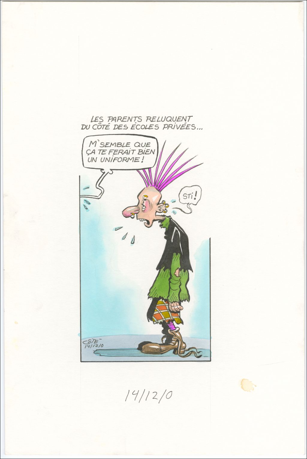 Les parents reluquent du côté des écoles privées… "M'semble que ça te ferait bien un uniforme!" [Jeune] : "Sti!", 14 décembre 2000, Archives nationales à Québec, Fonds André-Philippe Côté, (03Q,P687,S1,P2000-12-14-1), André-Philippe Côté.