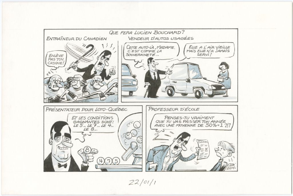 Entraîneur du Canadien. "Enlève pas ton casque!" Vendeur d'autos usagées. "Cette auto-là, madame, c'est comme la souveraineté¿ Elle a l'air vieille mais elle n'a jamais servi!"Présentateur pour Loto-Québec. "Et les conditions gagnantes sont : le 5¿ le 6... le 4... le 8...Professeur d'école. "Penses-tu vraiment que tu vas passer ton année avec une moyenne de 50% + 1?!?"