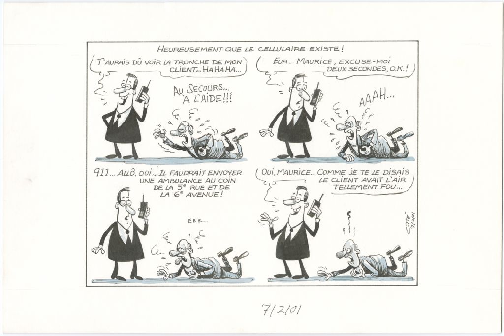 Heureusement que le cellulaire existe ! [Homme] : « T'aurais dû voir la tronche de mon client… hahaha... » [Homme au sol] : « Au secours… à l'aide !!! » [Homme] : « Euh… Maurice, excuse-moi deux secondes, O.K. ! » [Homme au sol] : « Aaah... » [Homme] : « 911... Allô, oui... il faudrait envoyer une ambulance au coin de la 5e rue et de la 6e Avenue » [Homme au sol] : « Eee..... » [Homme] : « Oui, Maurice... comme je te le disais le client avait l'air tellement fou... »