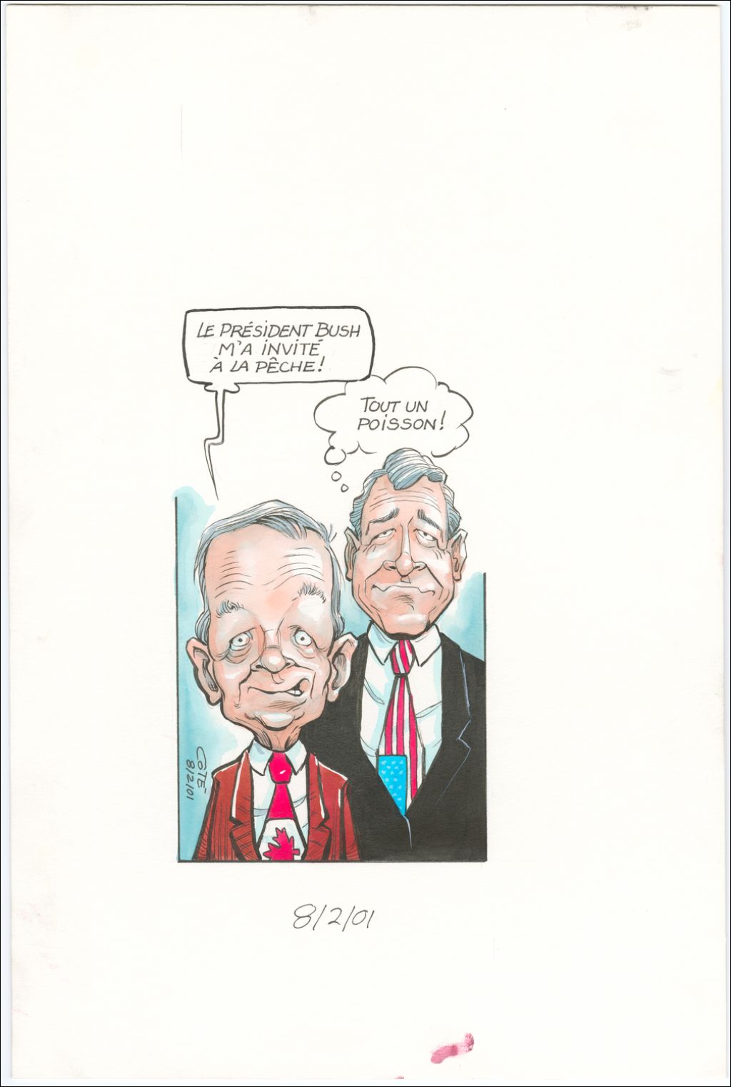 [Jean Chrétien] : « Le président Bush m'a invité à la pêche ! » [Georges Bush] : « Tout un poisson ! », 8 février 2001, Archives nationales à Québec, Fonds André-Philippe Côté, (03Q,P687,S1,P2001-02-08), André-Philippe Côté.