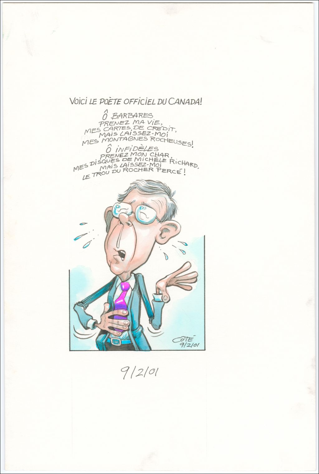 Voici le poète officiel du Canada ! [Stéphane Dion] : « Ô barbares prenez ma vie, mes cartes de crédit, mais laissez-moi mes montagnes rocheuses ! Ô infidèles prenez mon char, mes disques de Michèle Richard, mais laissez-moi le trou du Rocher Percé ! »