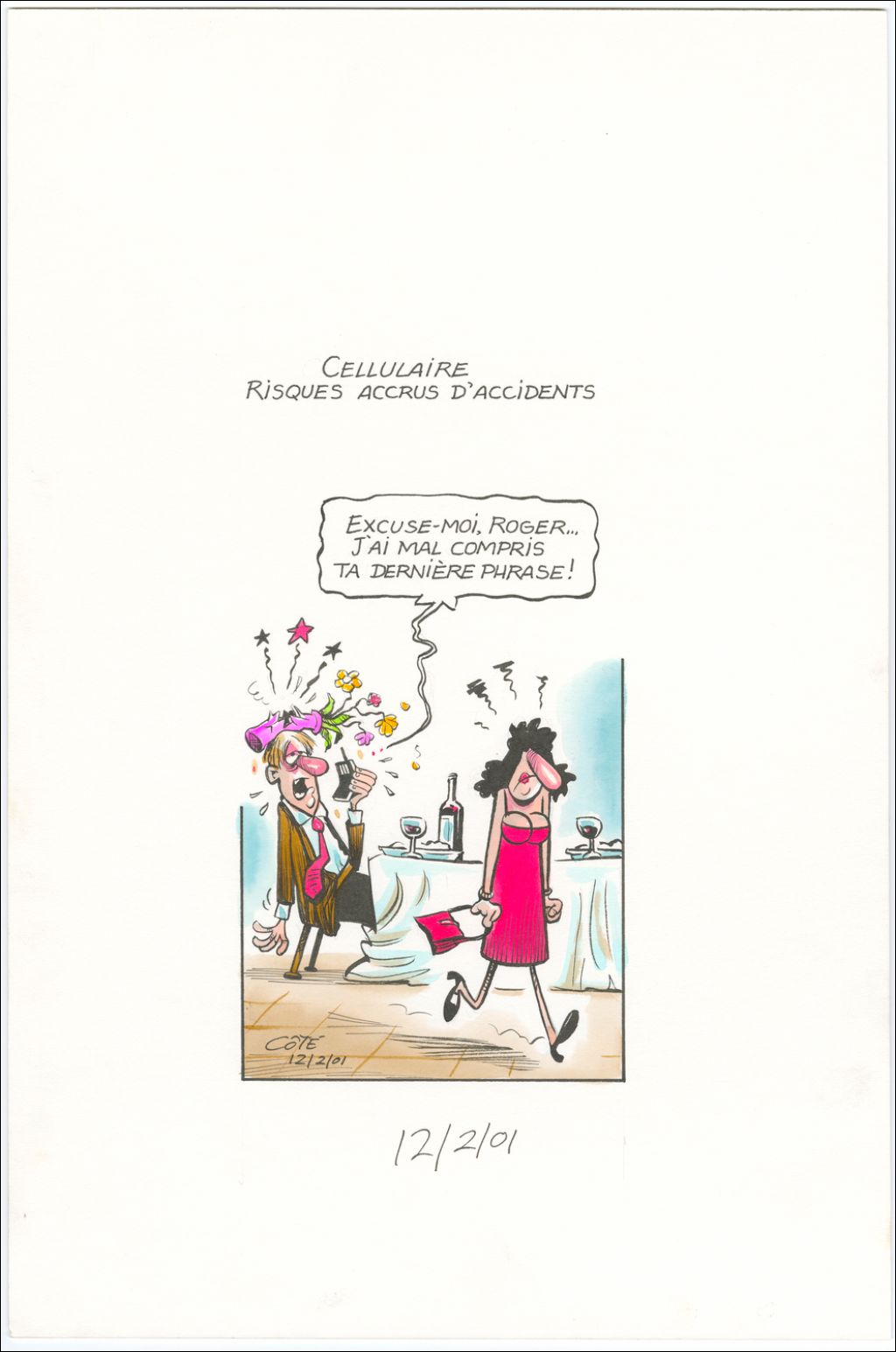 Cellulaire. Risques accrus d'accidents. [Homme] : « Excuse-moi, Roger… j'ai mal compris ta dernière phrase ! »