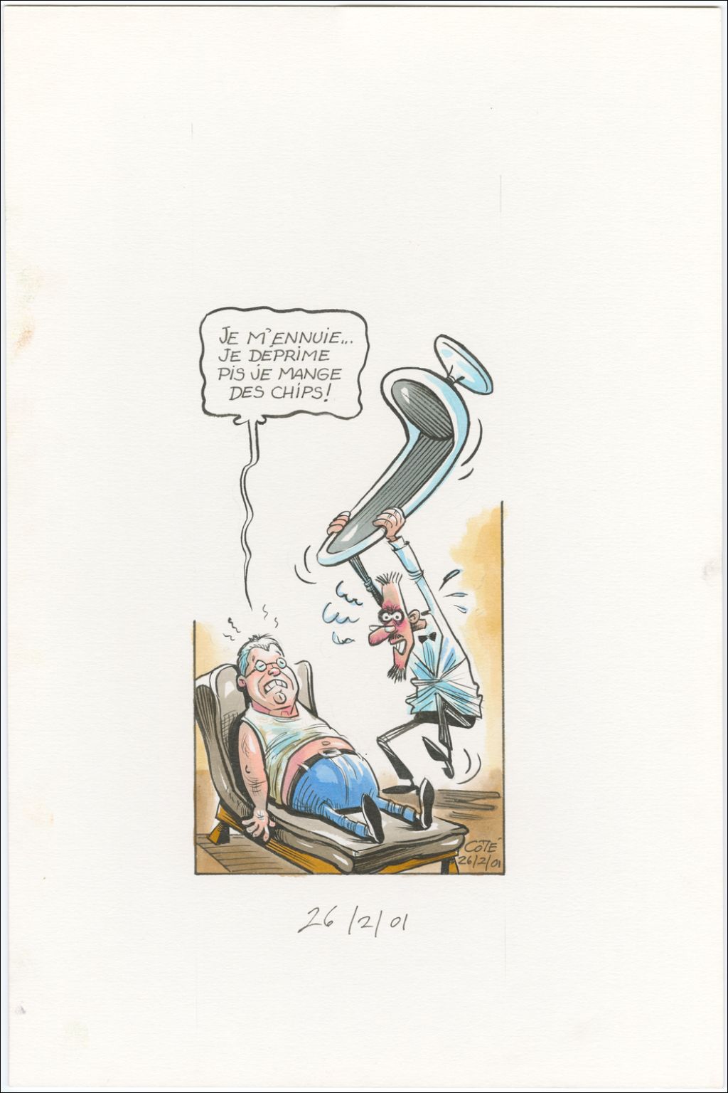 [Maurice "Mom" Boucher] : « Je m'ennuie… je déprime pis je mange des chips ! », 26 février 2001, Archives nationales à Québec, Fonds André-Philippe Côté, (03Q,P687,S1,P2001-02-26), André-Philippe Côté.