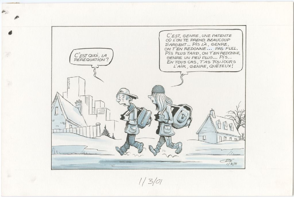 [Adolescent 1] : « C'est quoi, la péréquation ? » [Adolescent 2] : « C'est, genre, une patente où l'on te prend beaucoup d'argent… pis là, genre, on t'en redonne… pas full, pis plus tard, on t'en redonne, genre un peu plus… pis… en tout cas, t'as toujours l'air, genre, quêteux ! », 1er mars 2001, Archives nationales à Québec, Fonds André-Philippe Côté, (03Q,P687,S1,P2001-03-01-1), André-Philippe Côté.