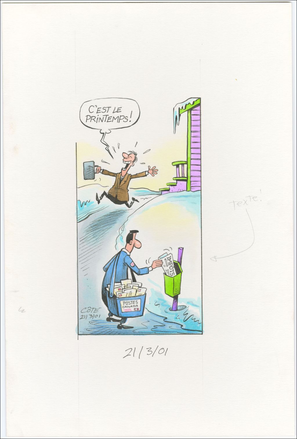 [Homme] : « C'est le printemps ! » [Le facteur glisse une lettre "Impôts" dans sa boîtes aux lettres], 21 mars 2001, Archives nationales à Québec, Fonds André-Philippe Côté, (03Q,P687,S1,P2001-03-21), André-Philippe Côté.
